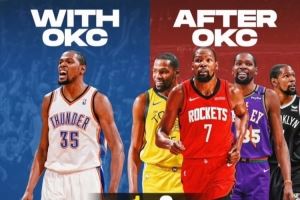 杜兰特雷霆生涯1MVP/0冠/17566分 后雷霆生涯0MVP/2冠/12955分