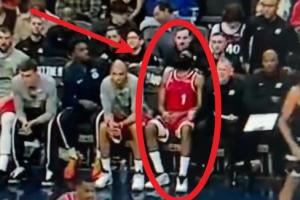 有点疲惫?哈登被换下场一屁股瘫坐在板凳上&抬头仰面